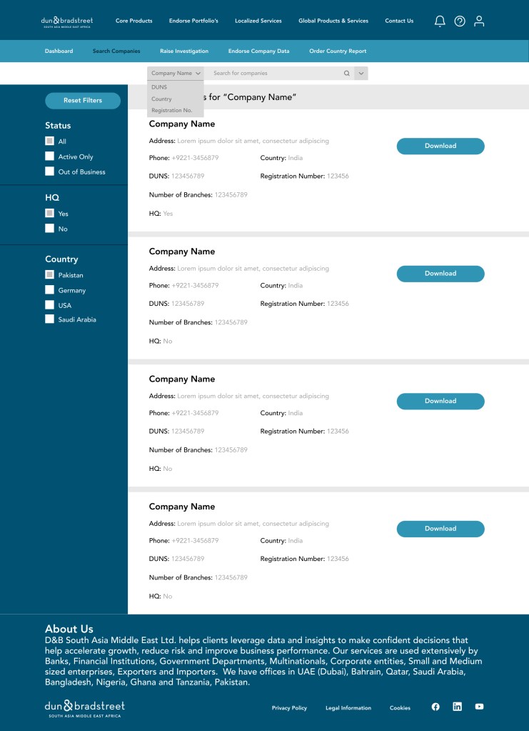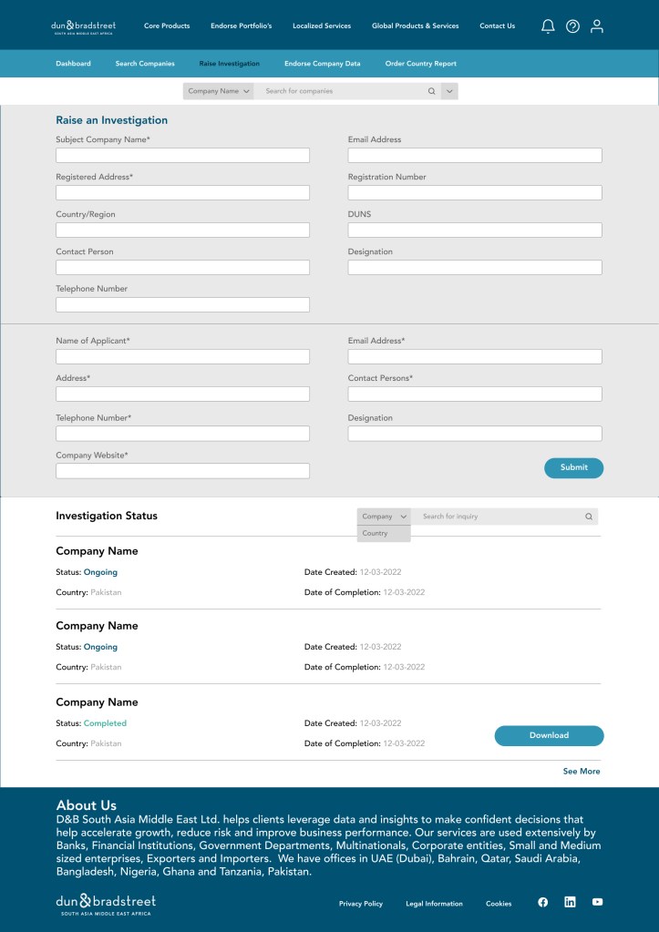 The website was designed for the Dun & Bradstreet Business Information Report (BIR). These reports are a product that the company sells and have complete financial information about requested companies, The objective was to design a subscription-based model for said reports where customers could sign in and look at the number of reports as well as other profile stats.